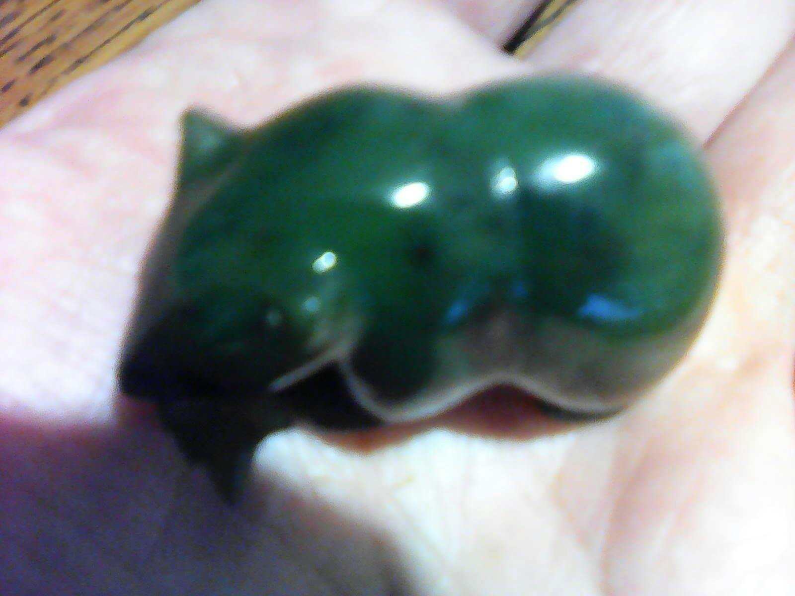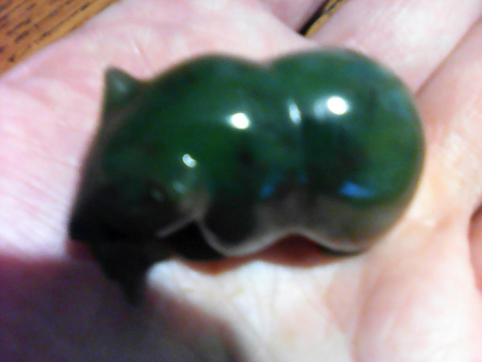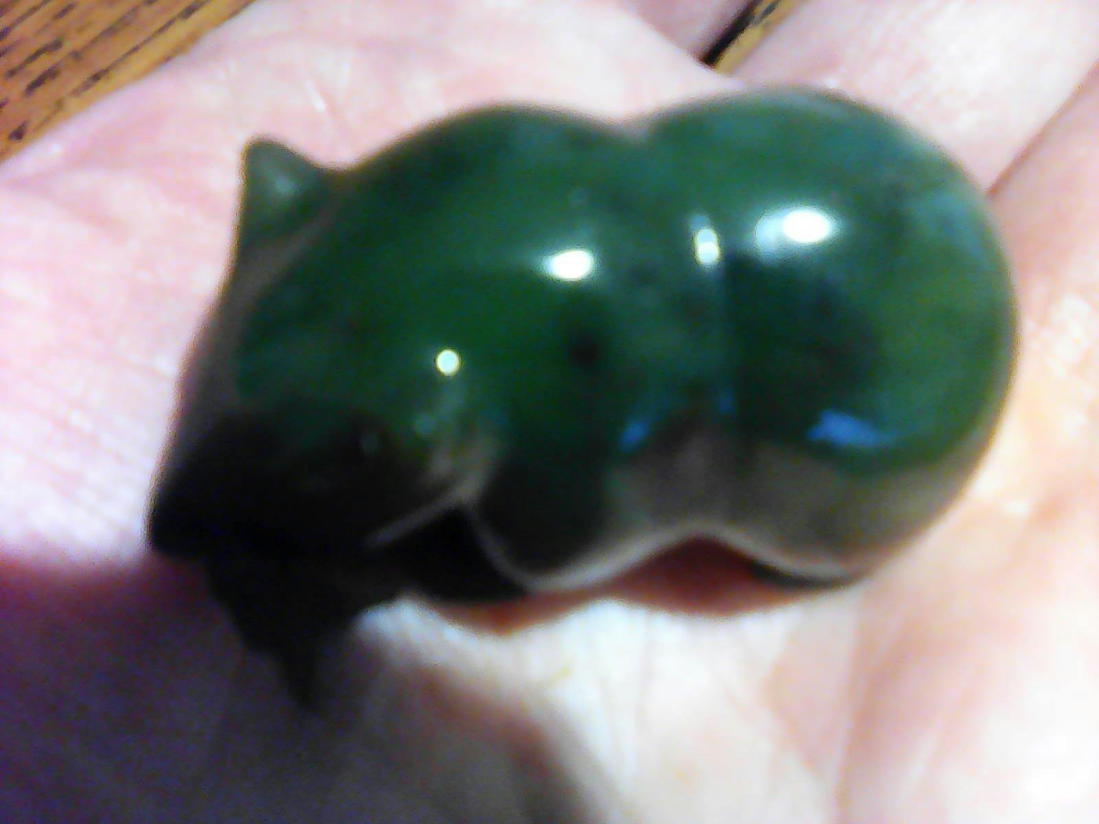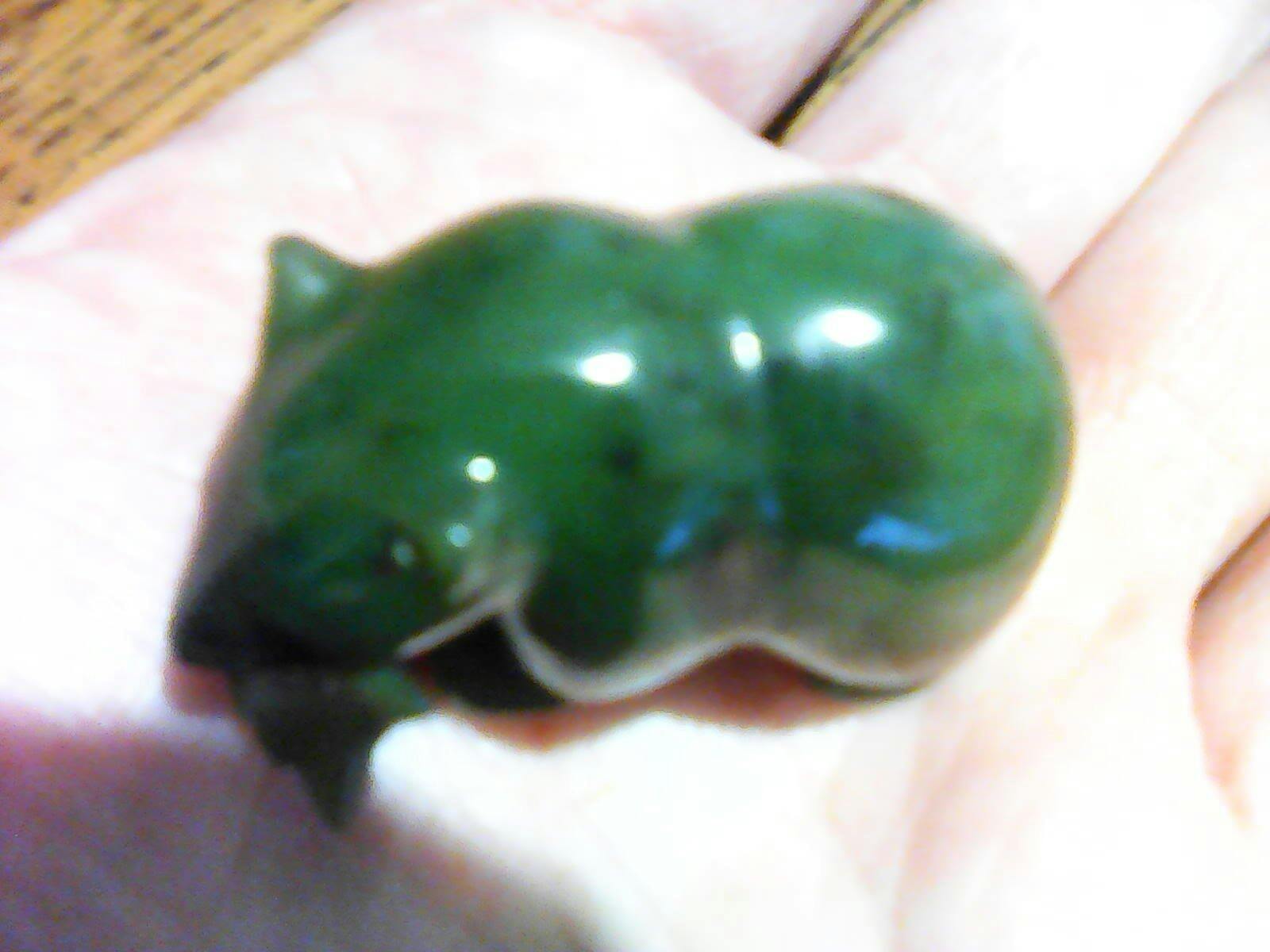 ce petit ours avec son poisson dans la gueule est très vivant , très parlant c'est tout le canada à lui tout seul, il ne fait que 3,8 cm certes tout petit mais très présent à tenir dans la main et même sur une table entouré d'autre objet en jade ou autre pierre , il reste bien présent et visible ! merci !