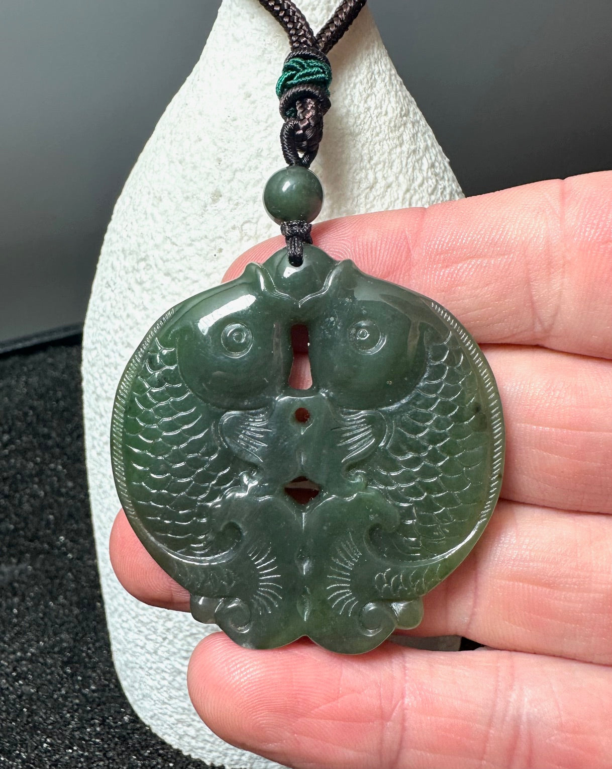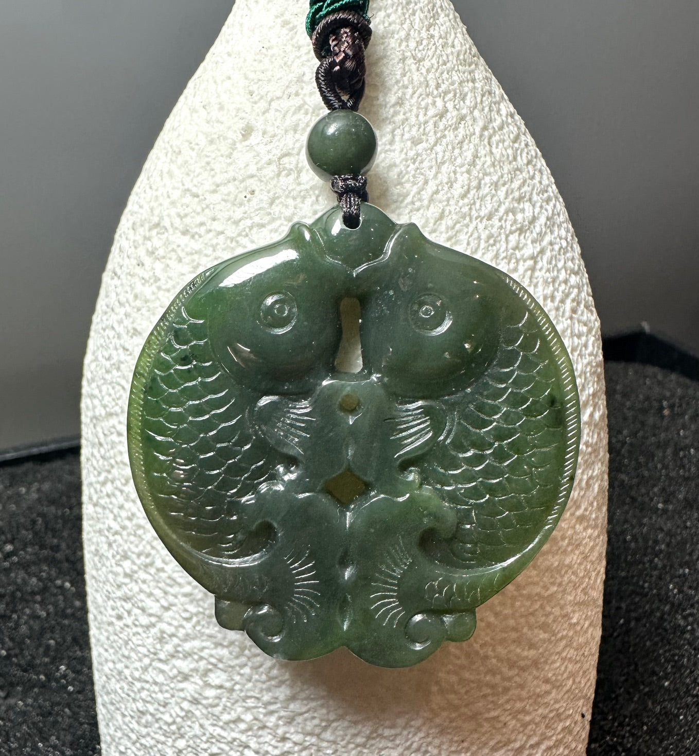 Deep Green Canadian Nephrite Jade Double fish pendant - This pendant measures approximately 50mm in size and comes with a fully adjustable cord. The jade in this pendant comes from our Ogden Mountain jade mine.