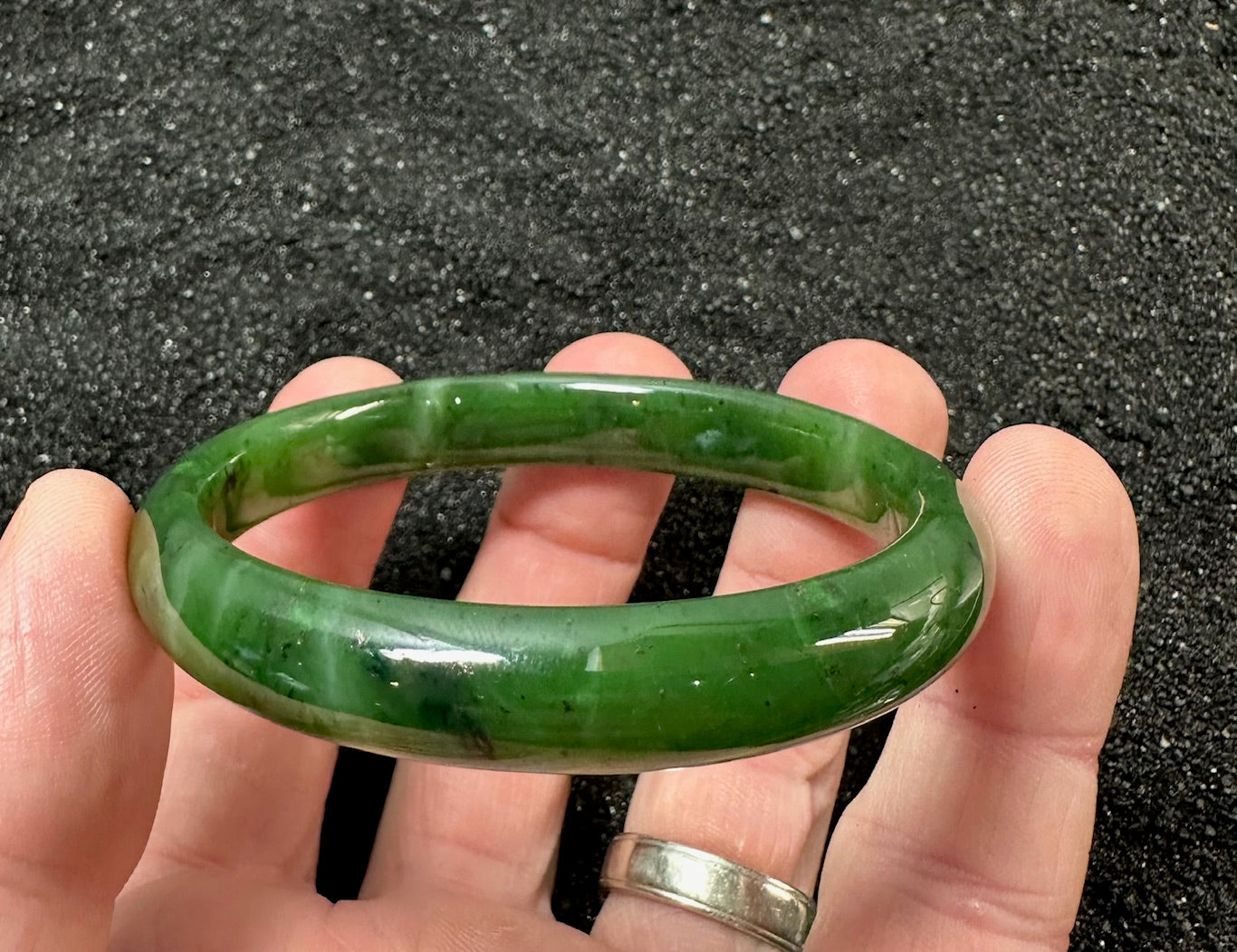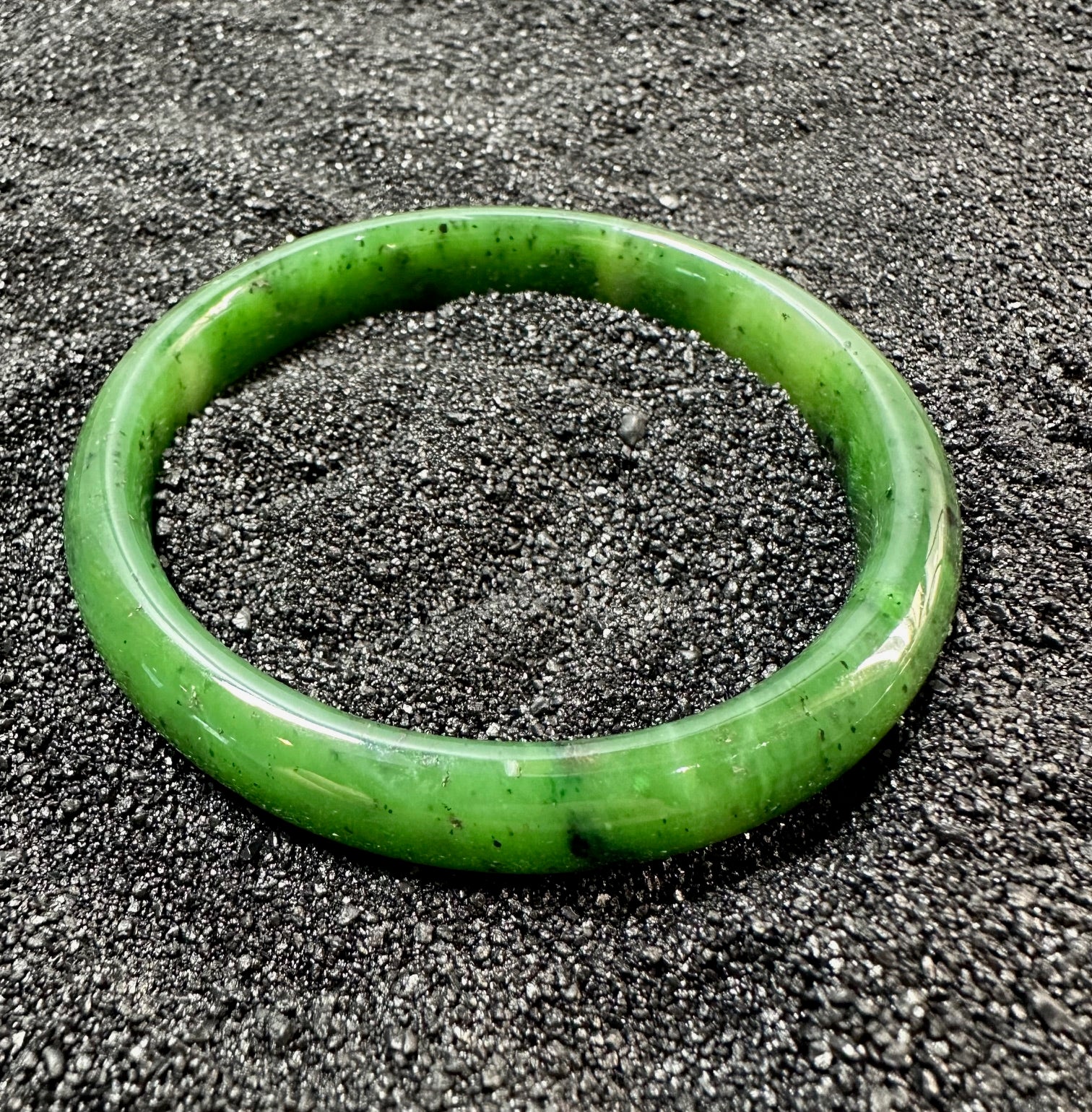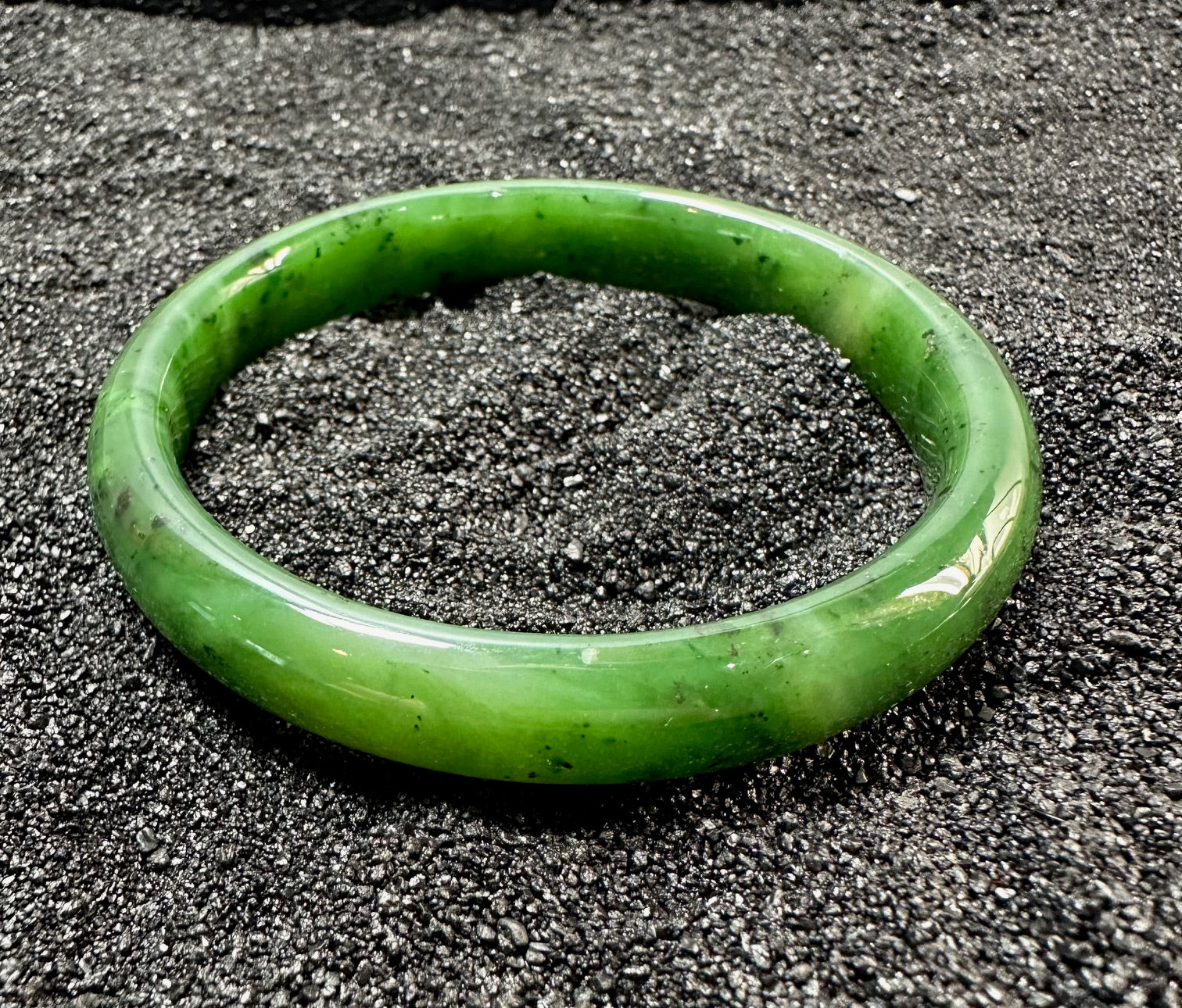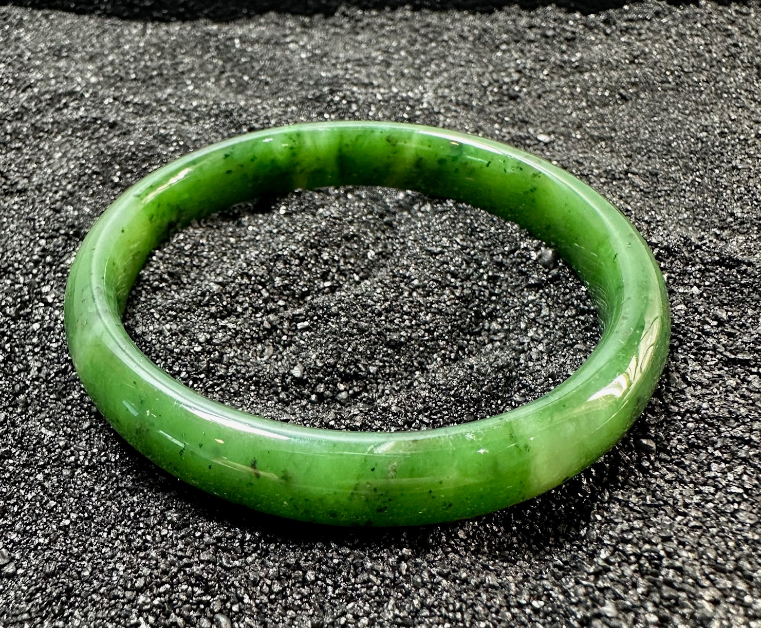Canadian Nephrite Jade bangle. This bangle will measure approximately 61mm x 11.5mm and will come complete in a black velvet gift pouch.