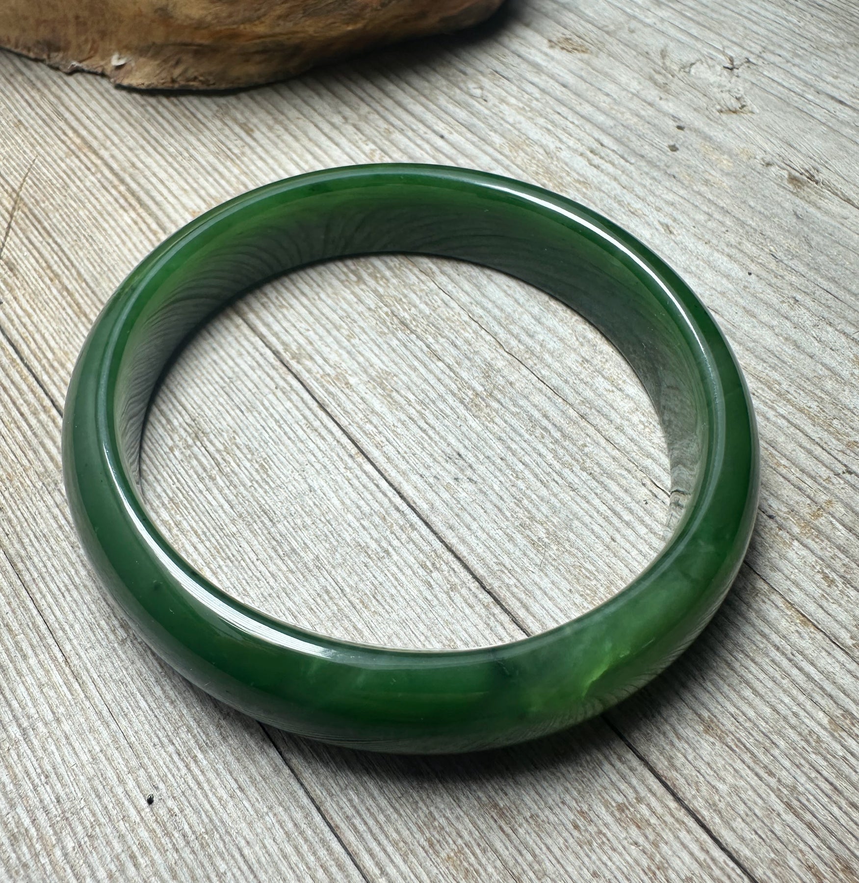 This authentic Canadian nephrite jade bangle showcases a deep, luxurious green hue characteristic of premium jade sourcing.