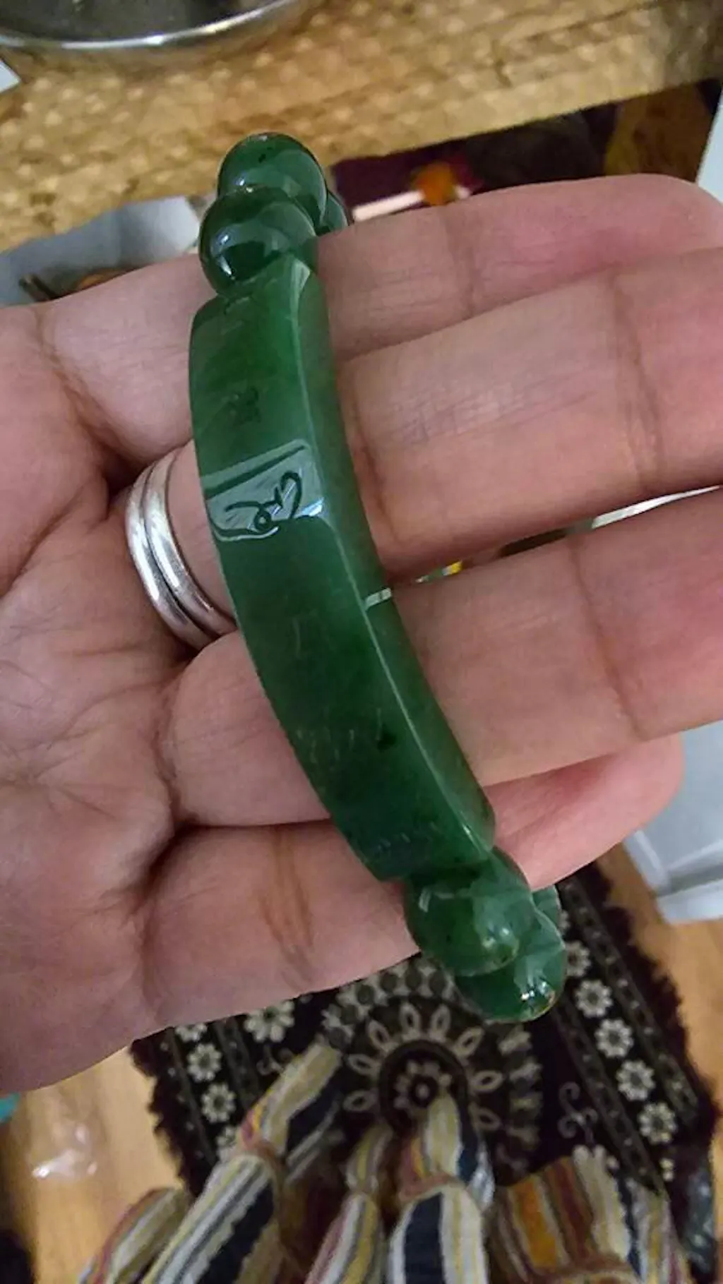 Beautiful mantra bracelet carved from Canadian Nephrite Jade. This bracelet has 15 10mm beads and a 48mm long rectangular piece. This bracelet is roughly " in size, it is on an elastic cord so it can stretch much bigger.