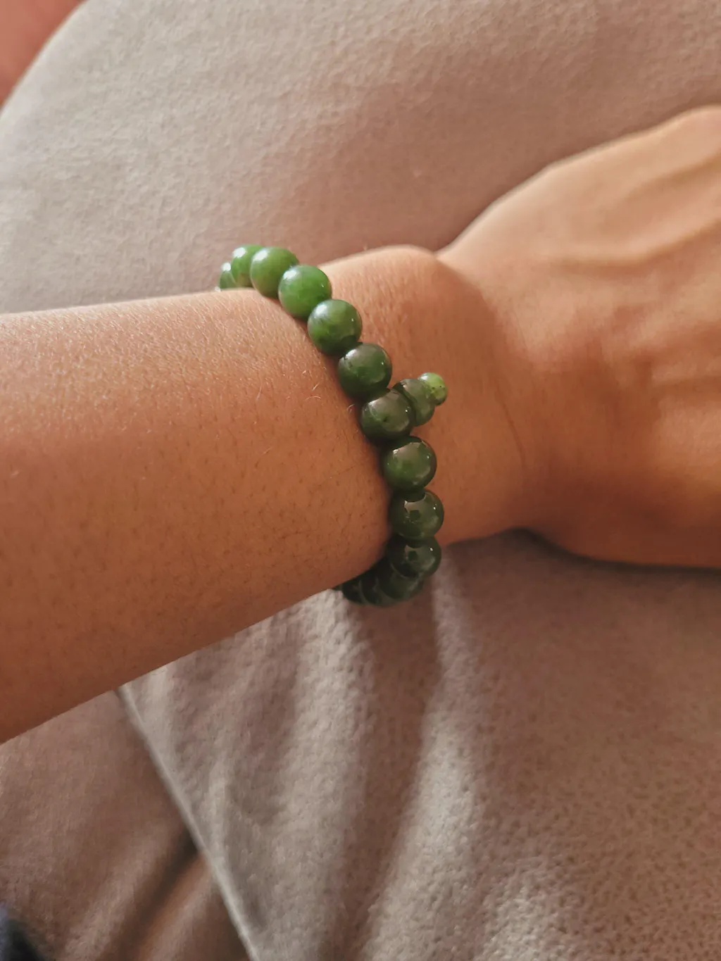 A stretchy Jade bracelet fashioned from 8mm round beads.