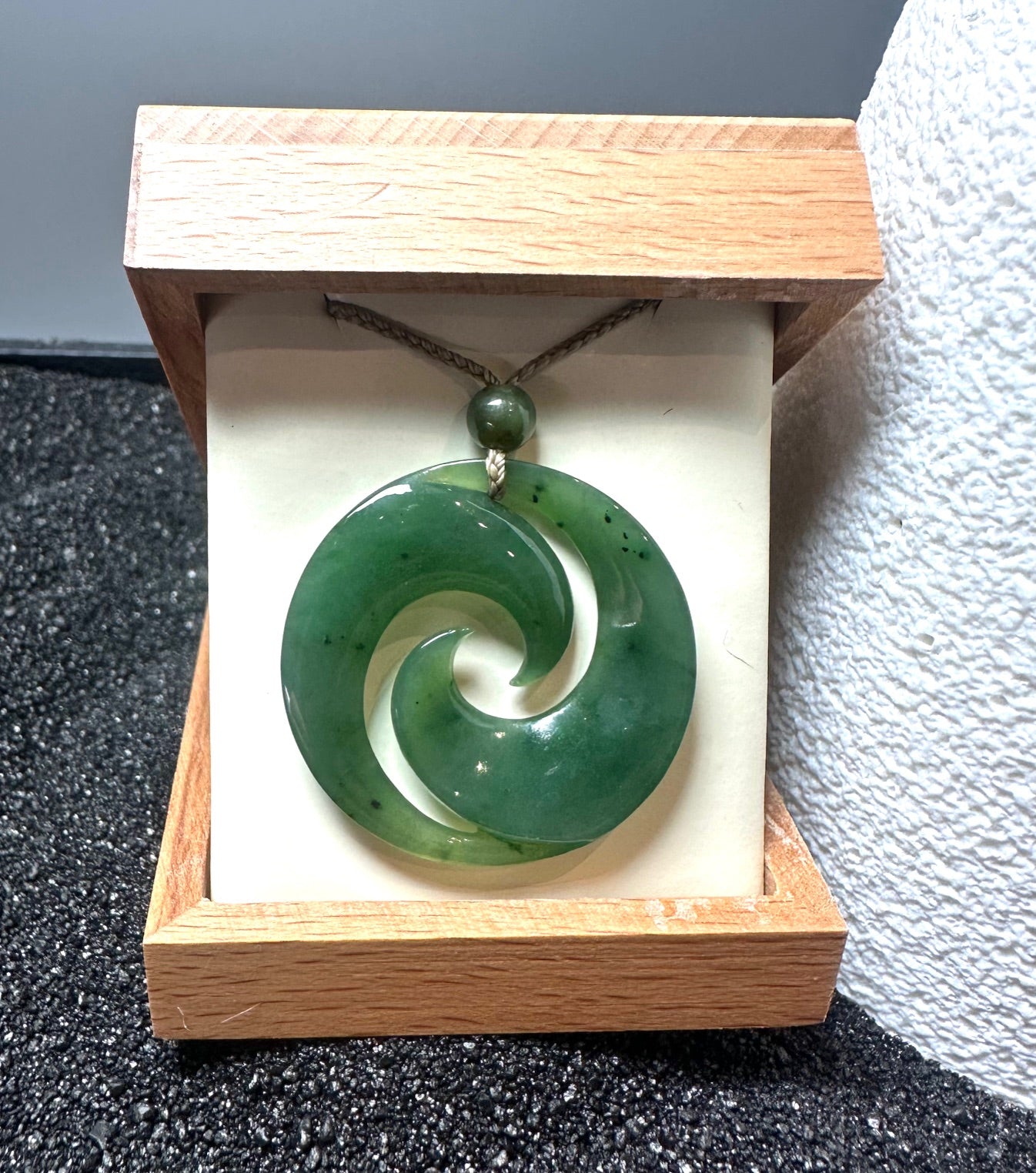 Beautiful Maori Styled Pendant carved out of solid jade. A striking Jade Pendant. Comes complete with a Hand Crafted Wooden Display Box and cord.