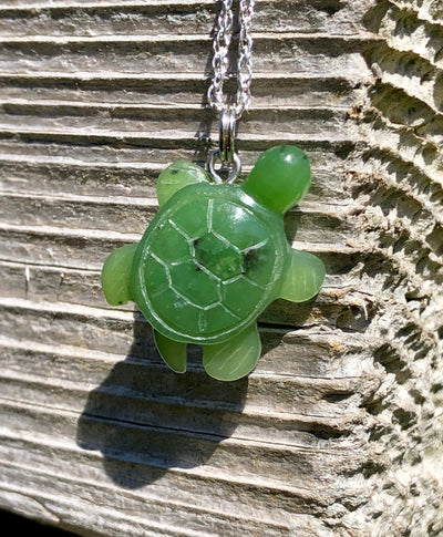 This smaller sized Canadian Jade Turtle pendant measures approximately 20mm in size. This pendant will come with or without a Sterling silver chain and will come complete with a hand crafted wooden gift box.All of our Jade is 100% natural.