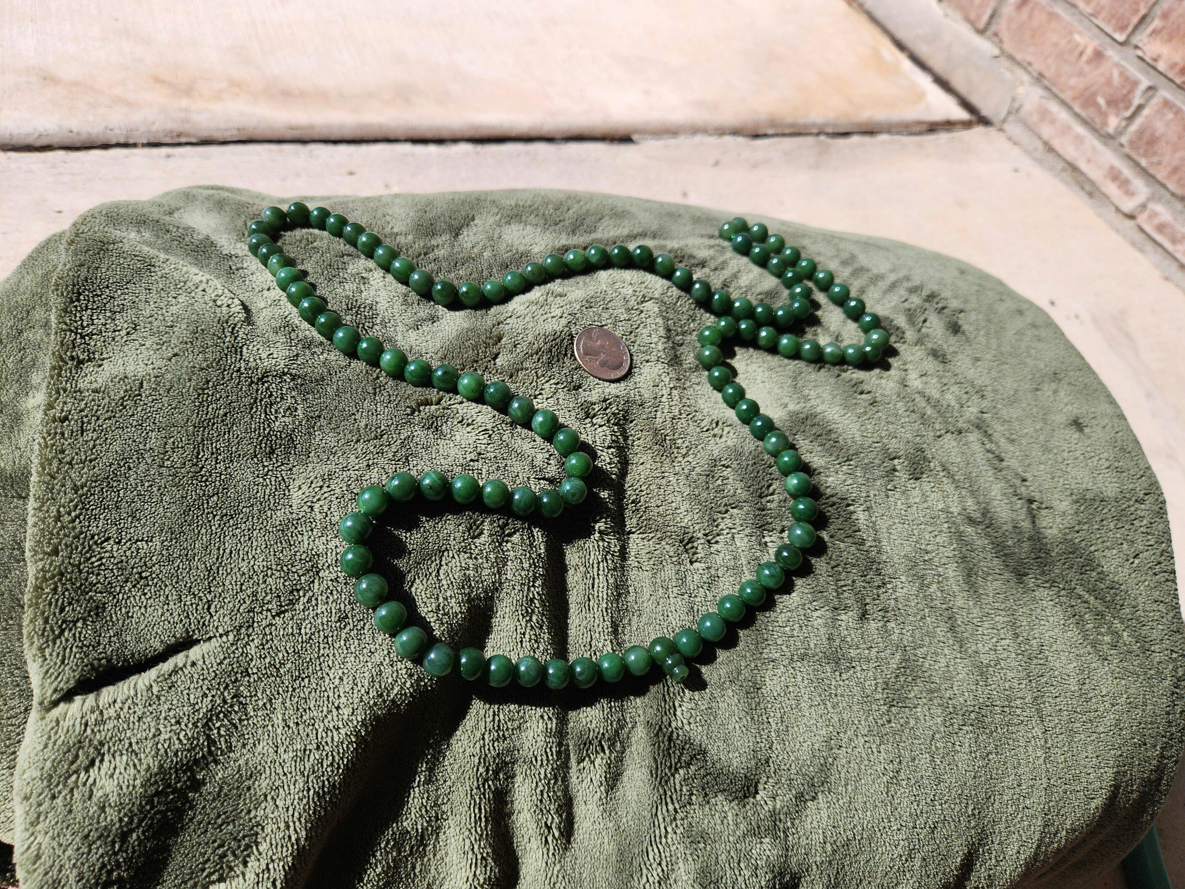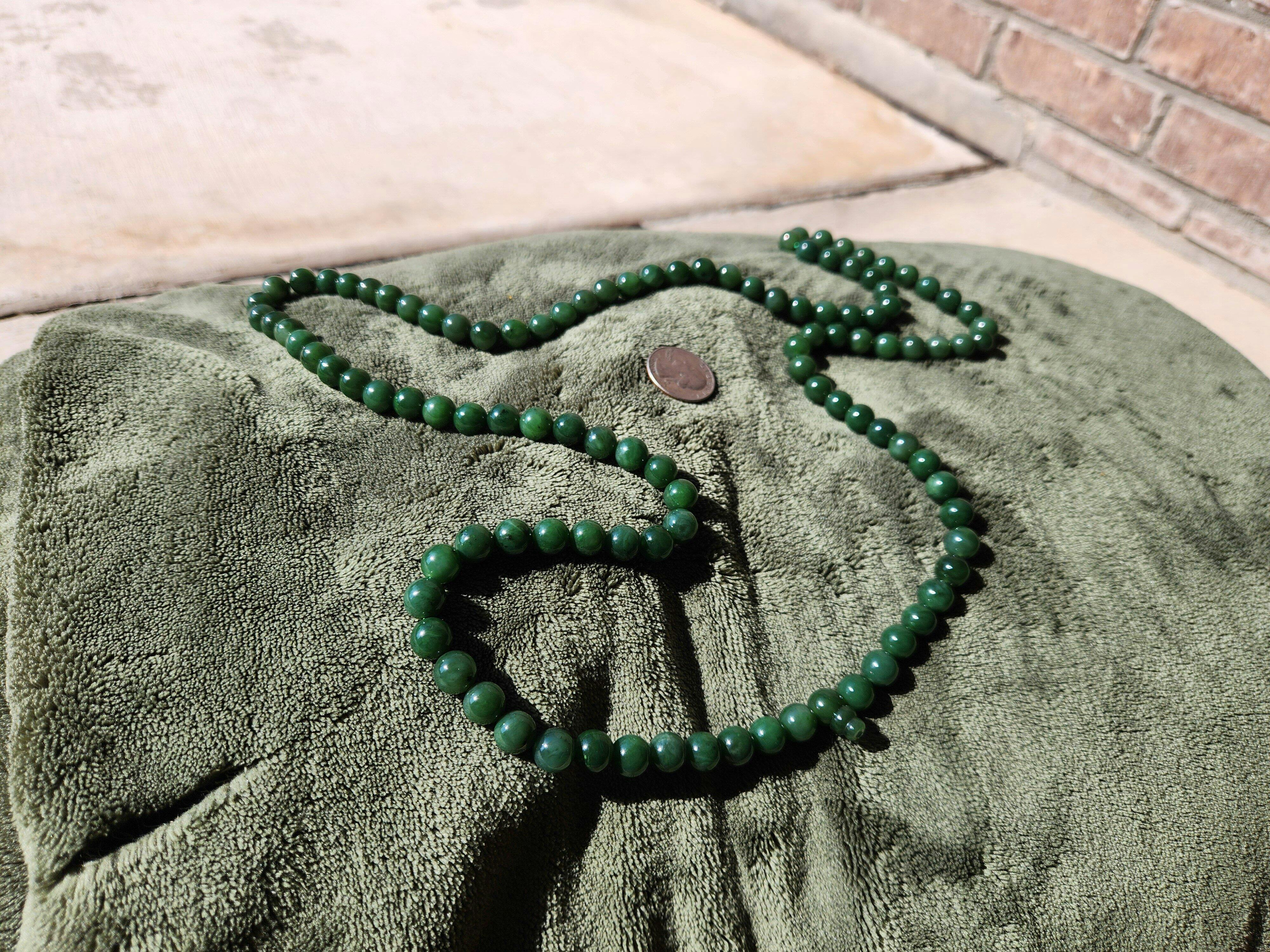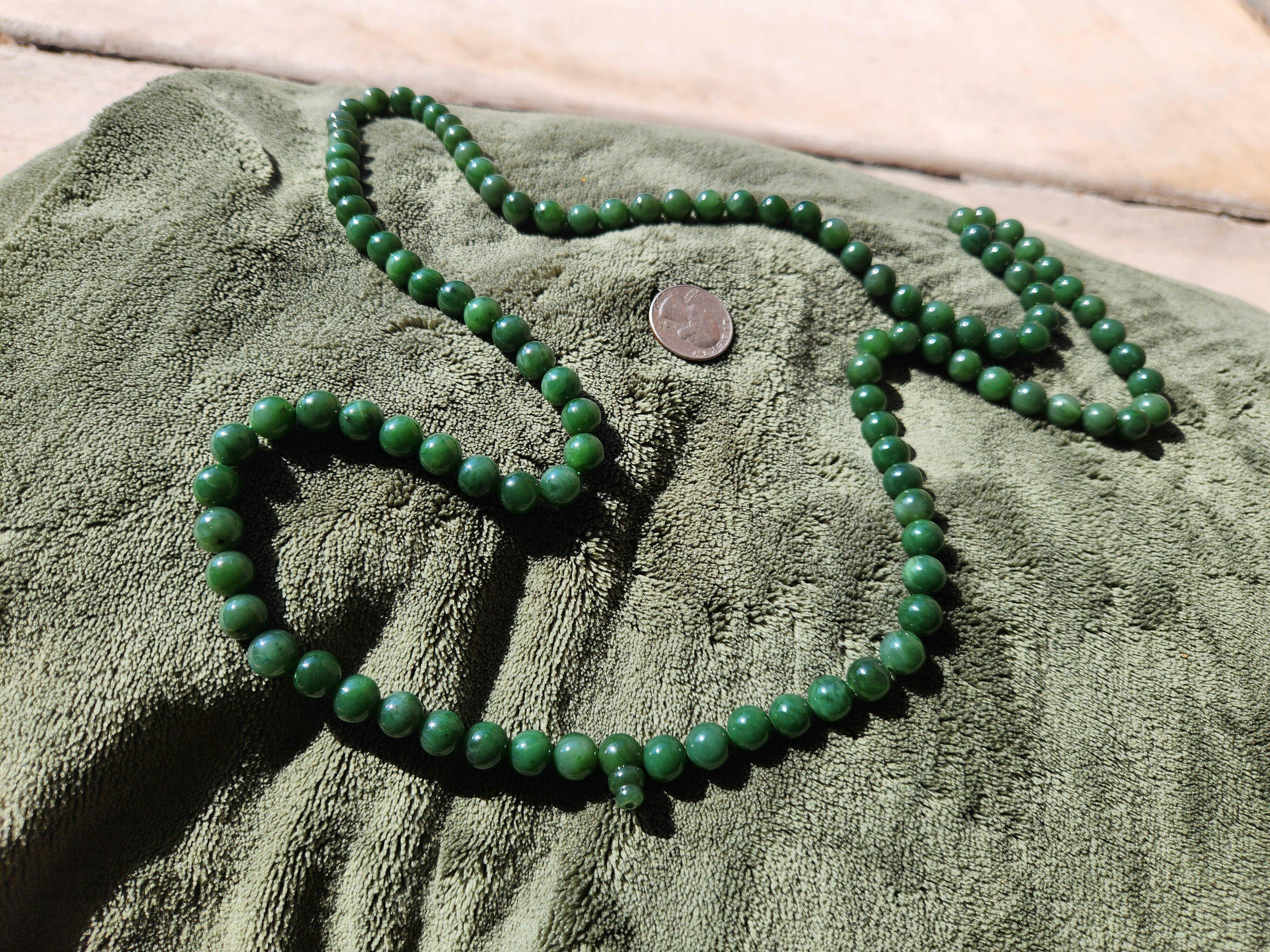 Beautiful Canadian Nephrite Jade mala. This mala comes in two sizes 8mm and 10mm. The 10mm mala will measure approximately 42" in length, the 8mm mala will measure approximately 33" All of our Jade is 100% Natural. Malas are used for keeping count while reciting, chanting, or mentally repeating a mantra or the name or names of a deity. This sādhanā (practice) is known in Sanskrit as japa. Malas are typically made with 18, 27, 54 or 108 beads. In Tibetan Buddhism, malas of 108 beads are used.