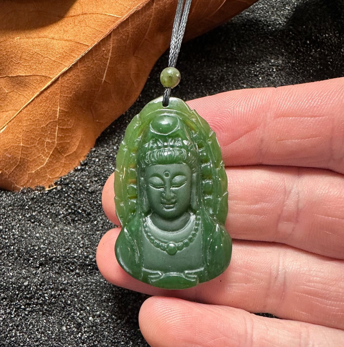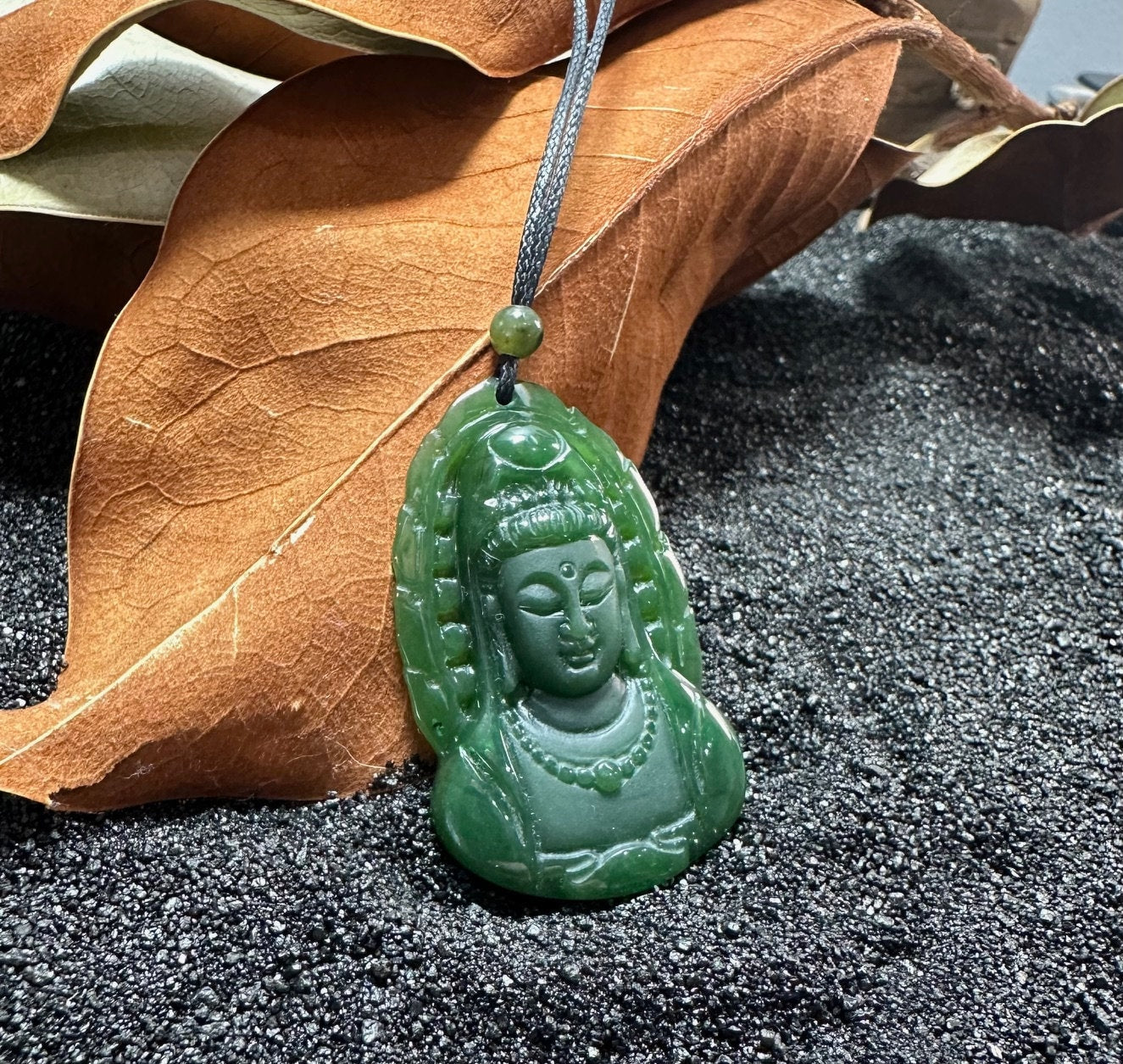 This Guanyin pendant carved from AA quality Canadian Nephrite Jade from the Cassiar mine. Very detailed with a satin face and high polish backdrop, this is a perfect pendant for that high end look. This pendant measures approximately 46mm and comes with an adjustable cord.