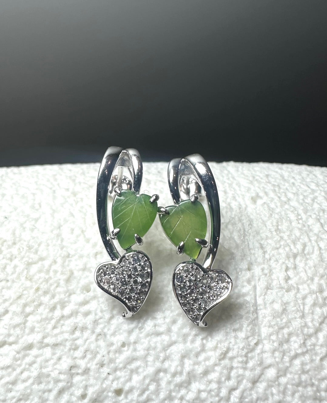 Canadian Nephrite Jade leaf and heart stud earrings. These earrings are set in Sterling Silver and have CZ's where the heart is.