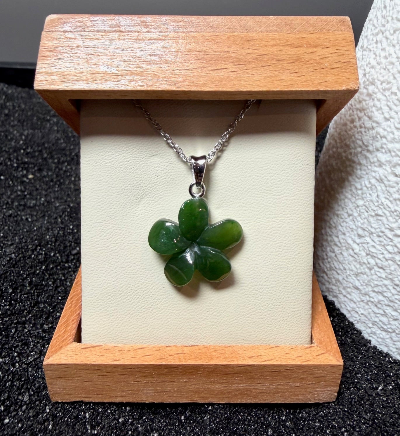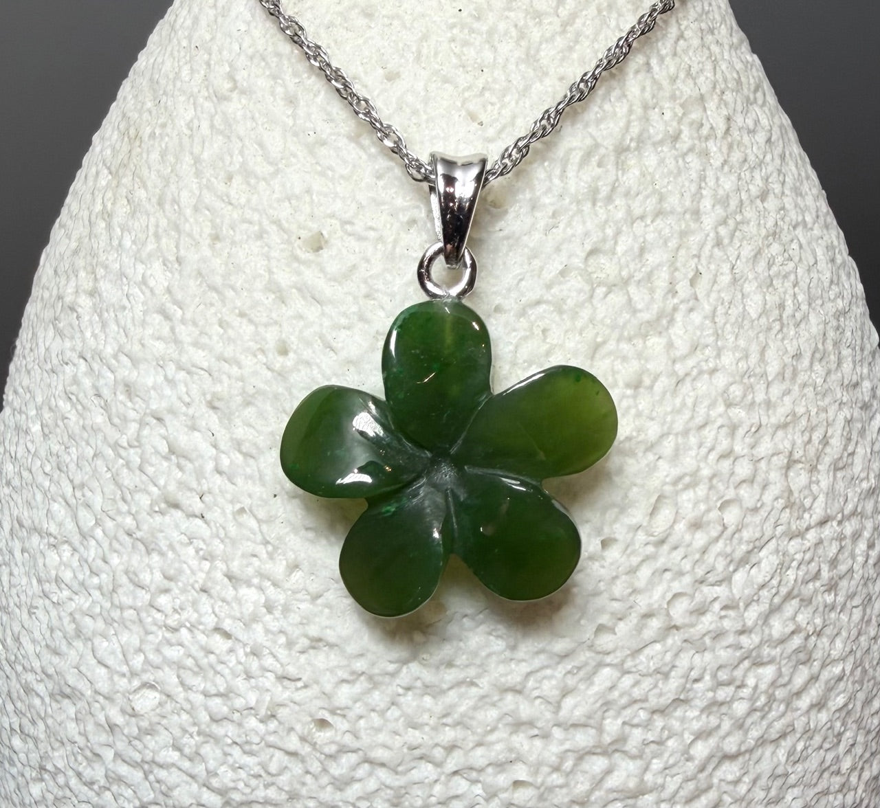 This smaller Plumeria Flower pendant is hand carved from Canadian Nephrite Jade. This pendant measures approximately 18mm in diameter and comes with or without a Sterling Silver chain.