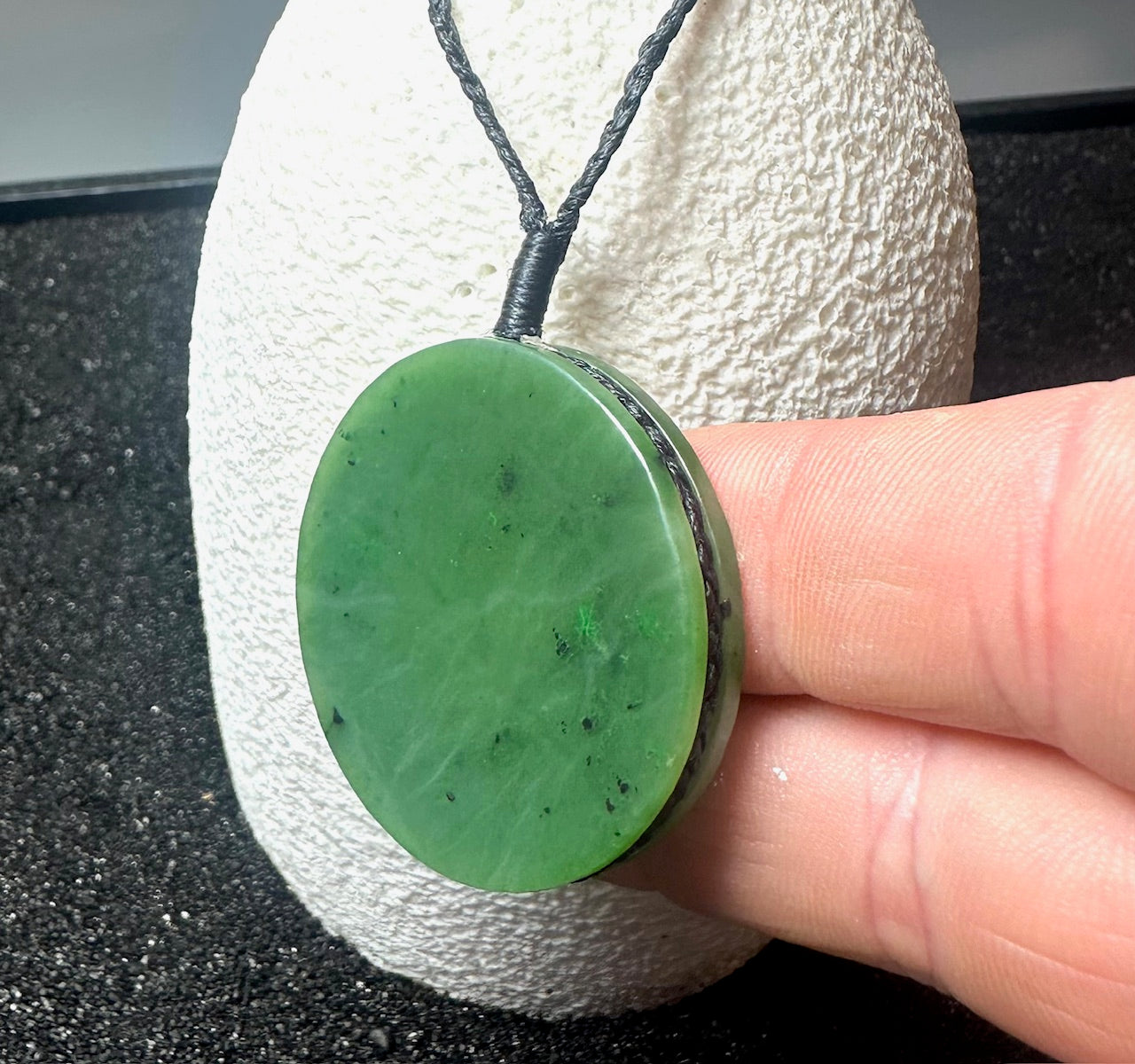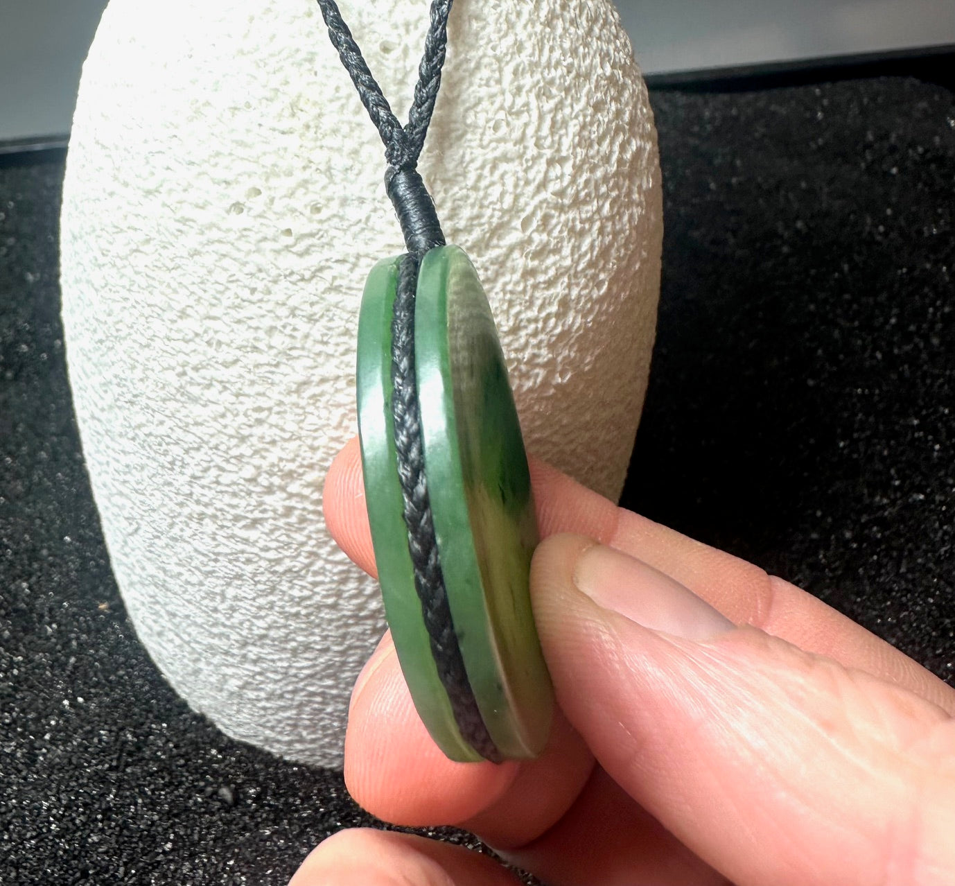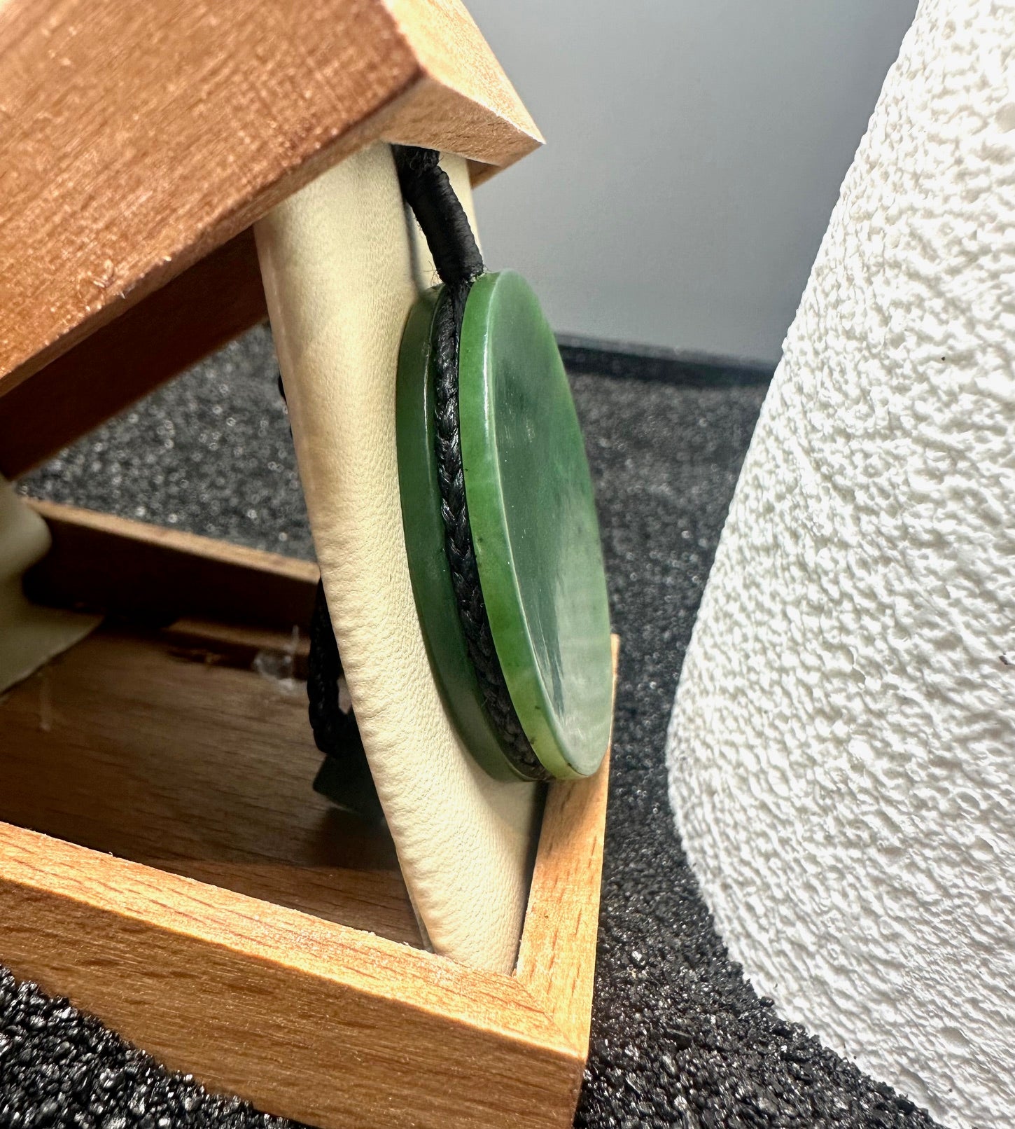 One of our favorites! This pendant is hand carved from Canadian Nephrite Jade. It will measures approximately 40mm in diameter and comes with a fully adjustable braided cord. The pendant is concave on both sides, making the middle very translucent. The cord is wrapped around the pendant in a small grove that is carved around the exterior of the pendant.