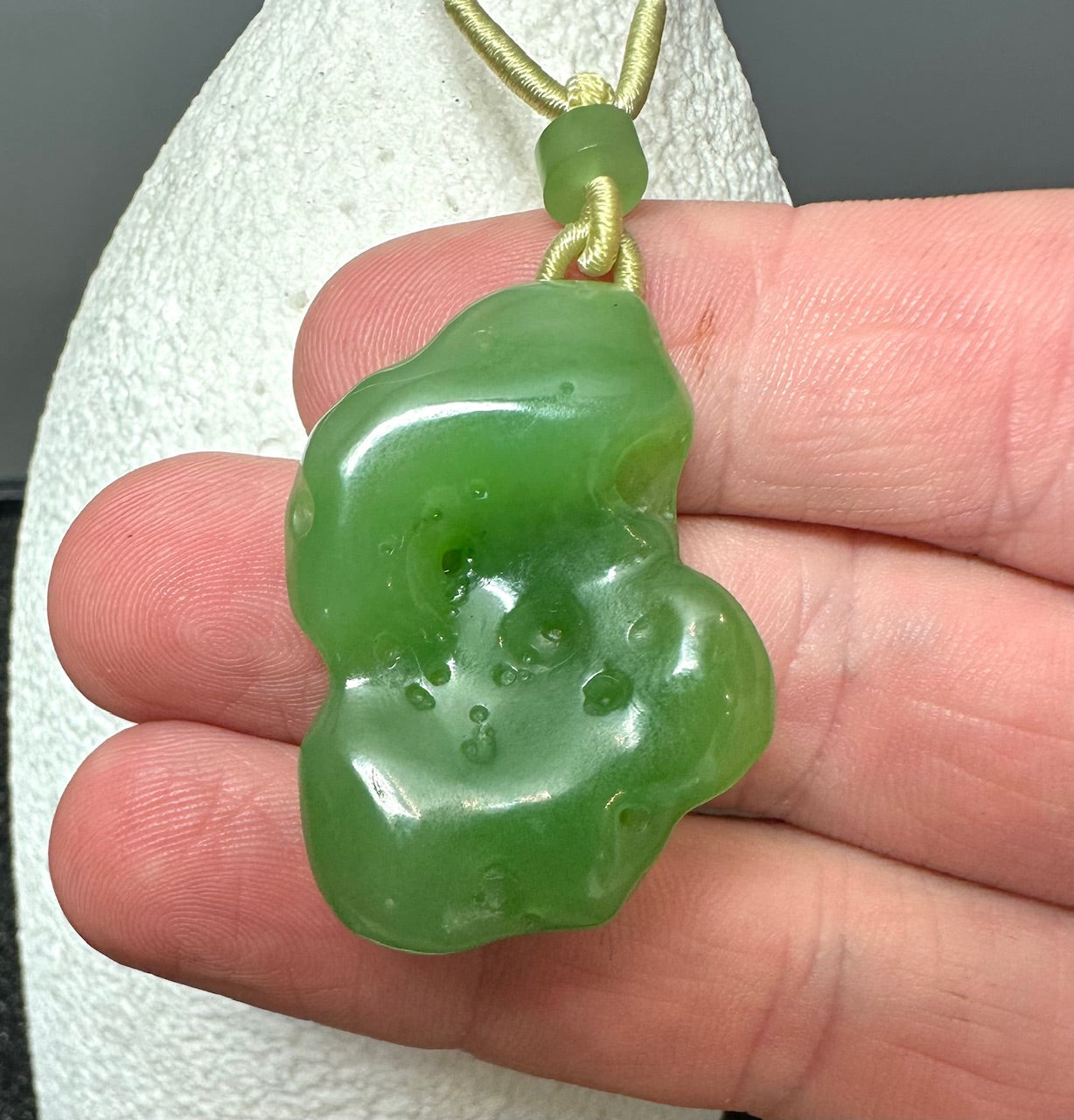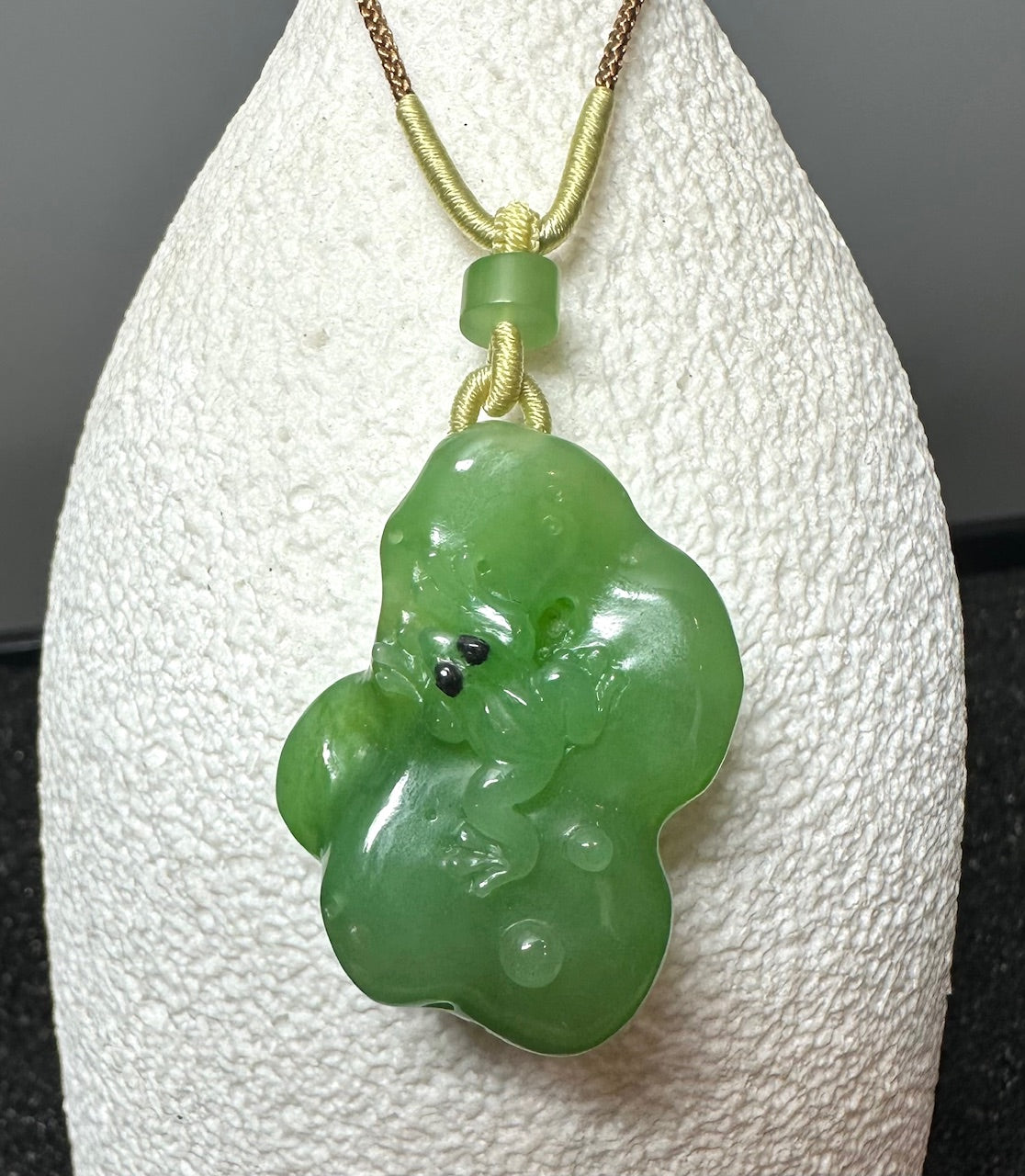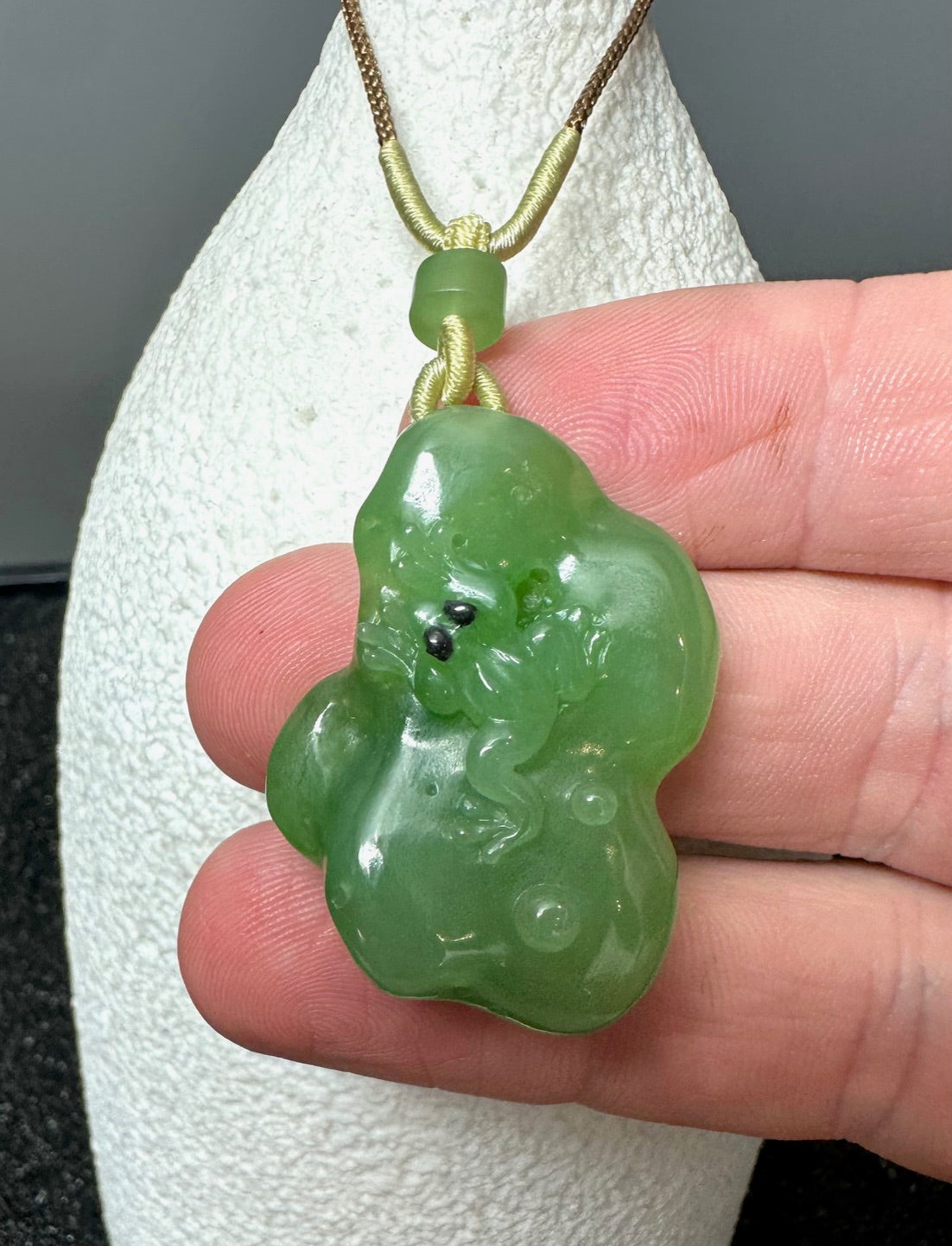 This distinctive Siberian Nephrite Jade frog pendant exemplifies nature's artistry, where naturally occurring black spots within the stone have been skillfully carved to form the frog's expressive eyes. The satin finish enhances the jade's subtle luminosity while maintaining an understated sophistication. This piece is unique, reflecting the organic variations inherent to authentic nephrite. Includes a fully adjustable cord and presentation-ready wooden gift box, making it both a personal keepsake and a thoughtful gift for jade enthusiasts.  This pendant will measure approximately 38mm x 26mm.