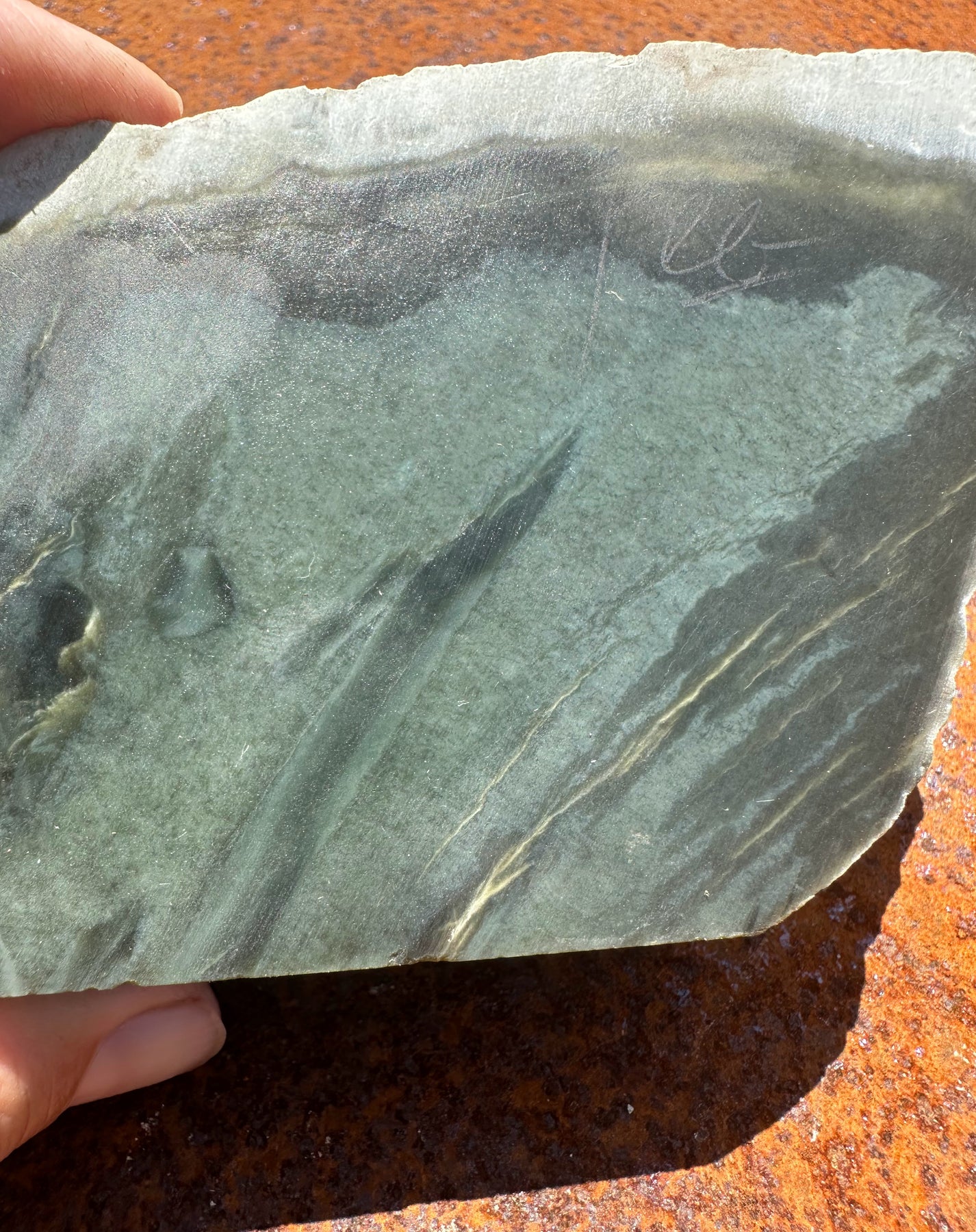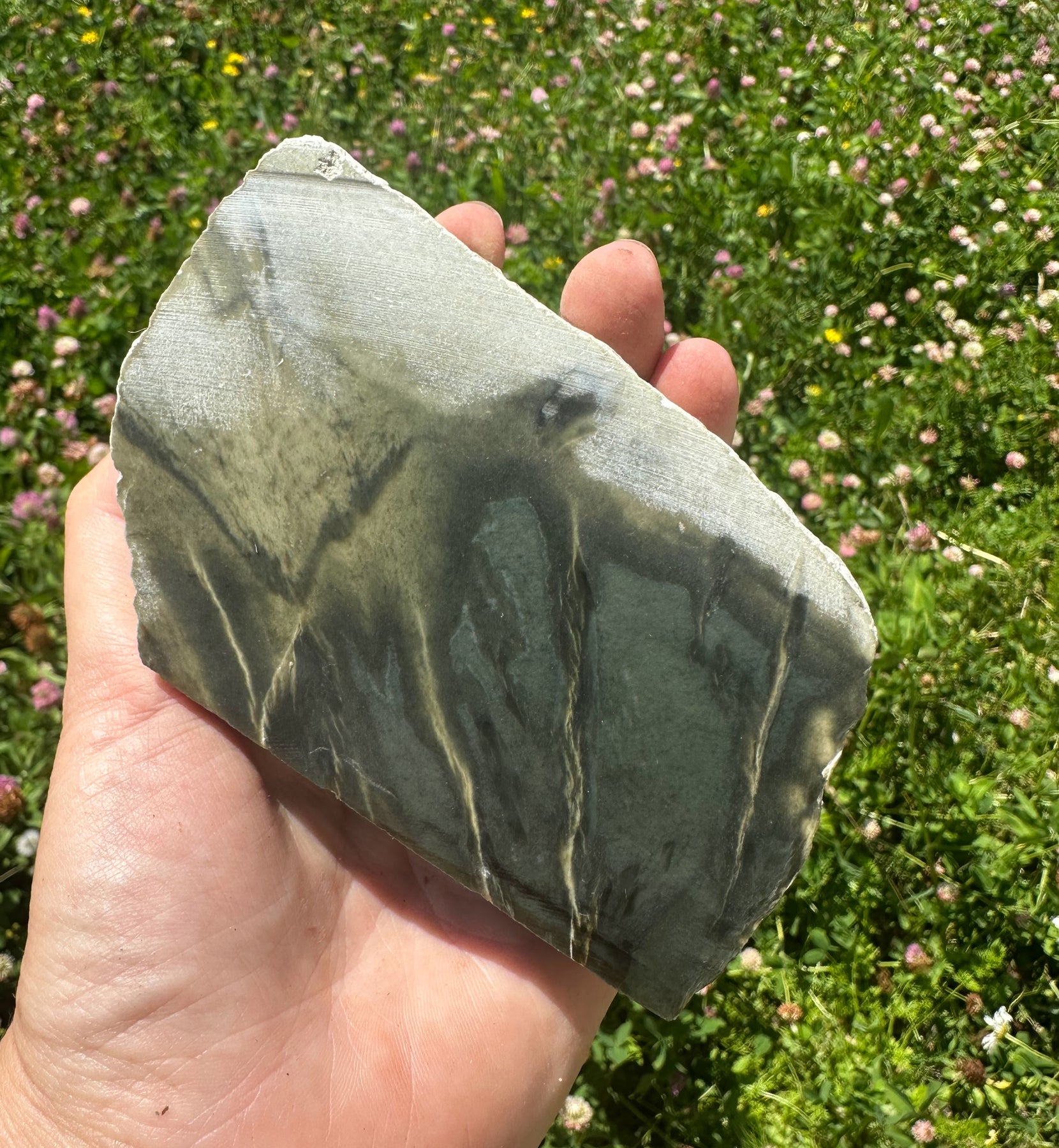 Wyoming Jade Specimen - this is from a jade collector's collection who collected for over 50 yearsIt weighs approximately 1 lbs 3ozMeasures 4" x 1.1" x 2.5"