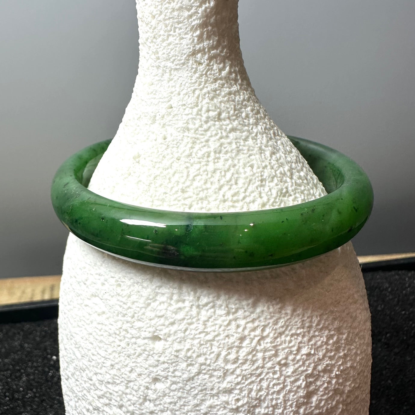 This Canadian Nephrite Jade bangle showcases the timeless elegance of authentic jade in a classic 60.5mm diameter with an 11mm band width. Hand-selected from premium Canadian sources, each piece exhibits the natural variations and subtle color gradations characteristic of genuine nephrite. The smooth, polished finish provides a comfortable fit for daily wear while maintaining the stone's inherent durability and luster. To ensure proper sizing for your wrist, refer to the sizing guide video provided. An investment in quality craftsmanship and natural beauty.