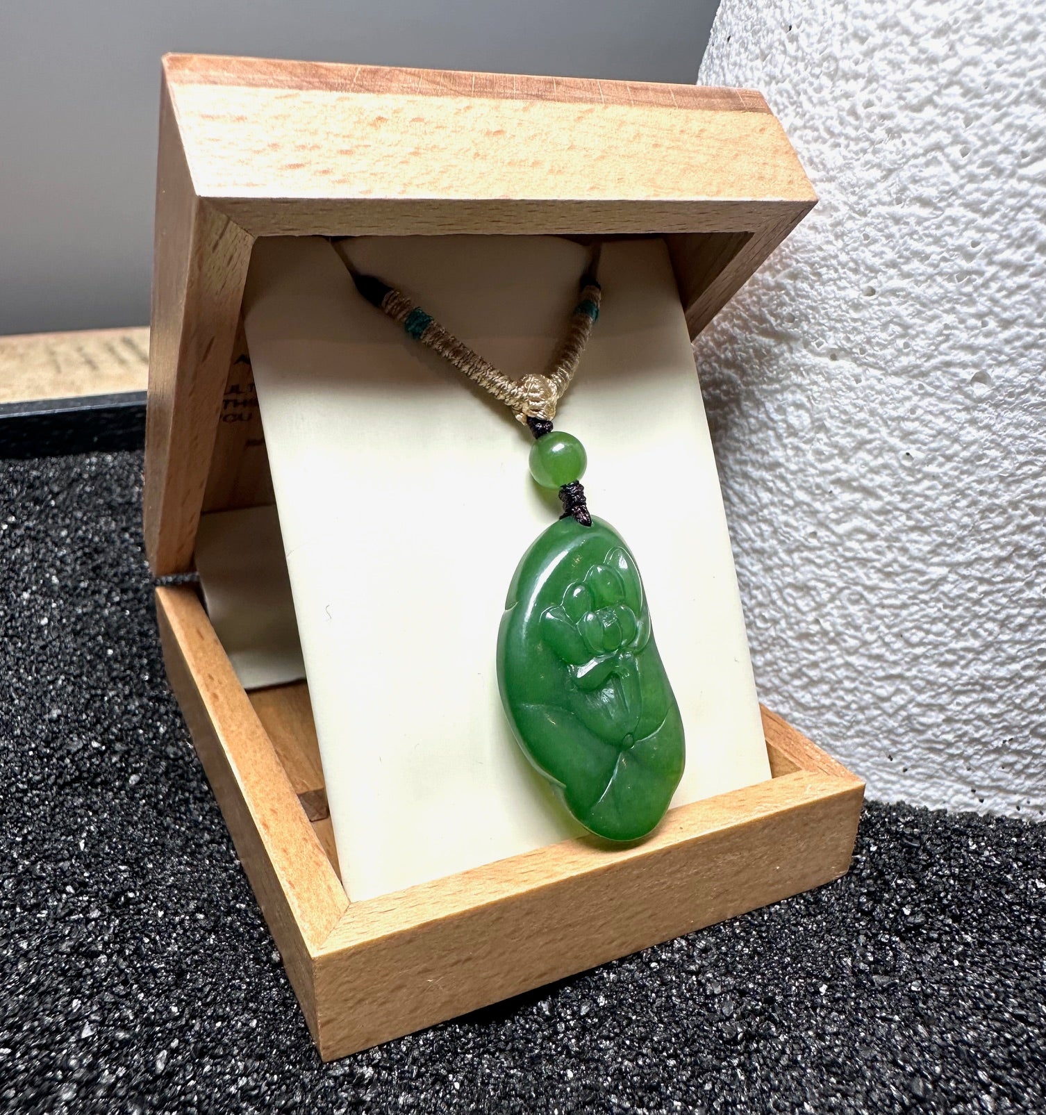 This exquisite Siberian Nephrite Jade flower pendant showcases the refined craftsmanship Jade Mine Canada is known for. Measuring 32mm, the piece features a satin finish that highlights the stone's natural beauty and subtle color variations. Carved with meticulous detail, this authentic nephrite jade pendant arrives ready to wear on a fully adjustable cord, making it versatile for any neckline. Presented in an elegant wooden gift box, it's an ideal choice for collectors or as a meaningful gift. A rare find—only one available.