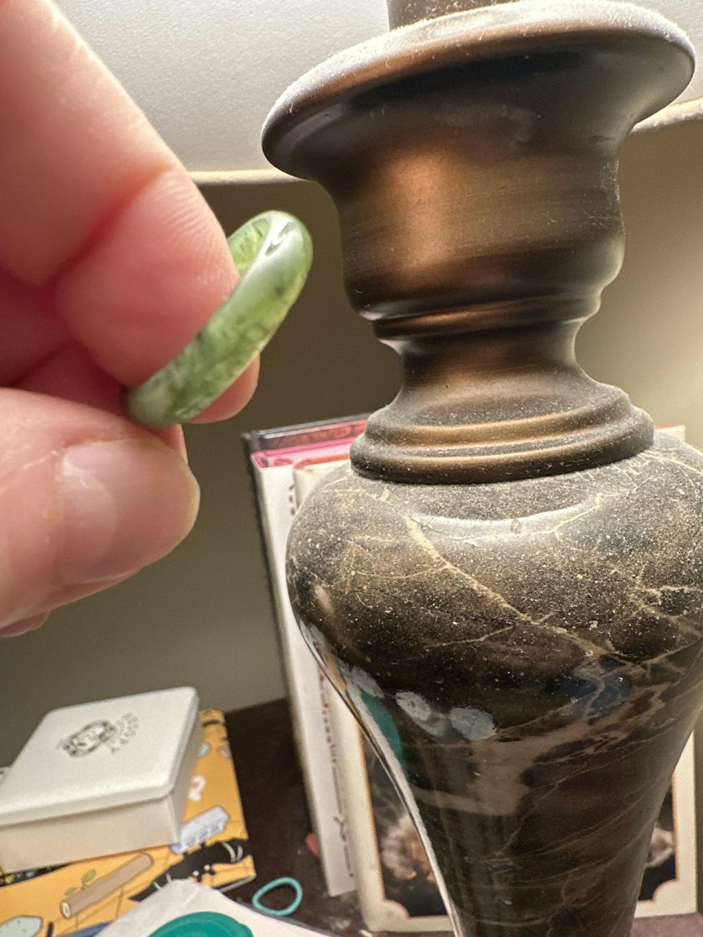 It’s so pretty! I love the variations of green throughout the ring when you hold it up to the light.